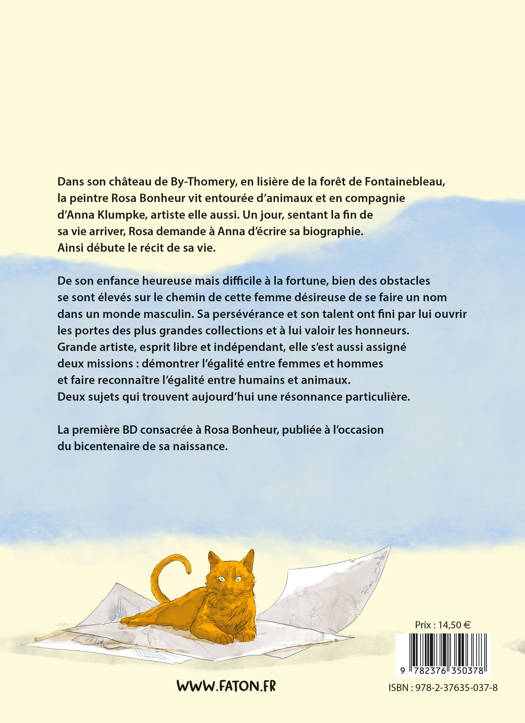 À l'occasion du bicentenaire de la naissance de Rosa Bonheur<br /><br /><br /> Dans son château de By-Thomery, en lisière de la forêt de Fontainebleau, la peintre Rosa Bonheur vit entourée d'animaux et en compagnie d'une amie chère, Anna Klumpke. Un jour, sentant la fin de sa vie arriver, l'artiste demande à Anna d'écrire sa biographie. Ainsi débute le récit de sa vie. <br /> De son enfance heureuse mais difficile auprès de sa mère à la fortune, bien des obstacles se sont élevés sur le chemin de cette femme désireuse de se faire un nom dans un monde masculin. Sa persévérance et son talent ont fini par lui ouvrir les portes des plus grandes collections et à lui valoir les honneurs. Grande artiste, esprit libre et indépendant, elle s'est aussi assigné deux missions : démontrer l'égalité entre femmes et hommes et faire reconnaître l'égalité entre humains et animaux. Deux sujets qui trouvent aujourd'hui une résonnance particulière. <br /><br /> Rosa Bonheur, peintre et amie des animaux est parue en avant-première dans le magazine jeunesse Le Petit Léonard, qui initie les enfants à l'art depuis plus de vingt ans en leur racontant la vie des grands artistes et en leur présentant de façon ludique de grandes pages de l'histoire de l'art. <br />