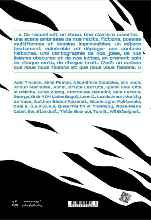 « Ce recueil est un show. Une clairière ouverte. Une scène embrasée de nos récits. Fictions, poésies multiformes et dessins imprévisibles dansent dans l’étendue de la forêt des publications cisgenres. Un espace hautement vulnérable où déployer nos contres histoires trans, inter et/ou non-binaires. Une cartographie de nos doutes, de nos lisières obscures et de nos luttes. Une éclaircie que nous berçons de nos intentions : en ménageant une place à chacun_es, en prenant soin de chaque mots, de chaque trait, en chérissant la valeur de chaque partage, la confiance et la détermination de toustes à s’exprimer. C’est un cadeau que nous nous faisons et que nous vous faisons. »