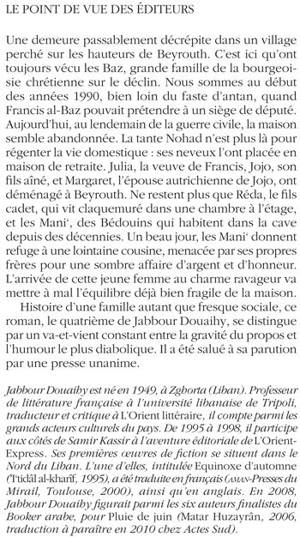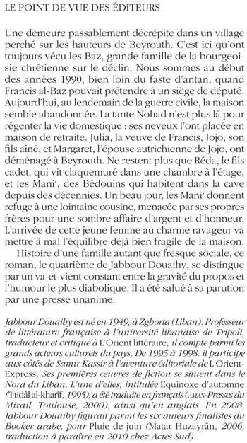 Une demeure passablement décrépite dans un village perché sur les hauteurs de Beyrouth. C'est ici qu'ont toujours vécu les Baz, grande famille de la bourgeoisie chrétienne sur le déclin. Nous sommes au début des années 1990, bien loin du faste d'antan, quand Francis al-Baz pouvait prétendre à un siège de député. Aujourd'hui, au lendemain de la guerre civile, la maison semble abandonnée. La tante Nohad n'est plus là pour régenter la vie domestique : ses neveux l'ont placée en maison de retraite. Julia, la veuve de Francis, Jojo, son fi ls aîné, et Margaret, l'épouse autrichienne de Jojo, ont déménagé à Beyrouth. Ne restent plus que Réda, le fi ls cadet, qui vit claquemuré dans une chambre à l'étage, et les Mani‘, des Bédouins qui habitent dans la cave depuis des décennies. Un beau jour, les Mani‘ donnent refuge à une lointaine cousine, menacée par ses propres frères pour une sombre affaire d'argent et d'honneur. L'arrivée de cette jeune femme au charme ravageur va mettre à mal l'équilibre déjà bien fragile de la maison. Histoire d'une famille autant que fresque sociale, ce roman, le quatrième de Jabbour Douaihy, se distingue par un va-et-vient constant entre la gravité du propos et l'humour le plus diabolique. Il a été salué à sa parution par une presse unanime.