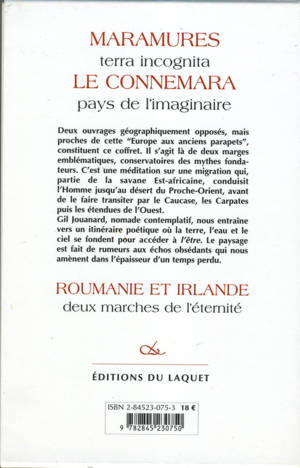 Regroupe les deux volumes publiés séparément : Maramures, terra incognita et Le Connemara, pays de l'imaginaire, deux récits de voyage, l'un en Carpates roumaines, près de la Hongrie, l'autre à l'extrême limite de l'Irlande du Nord-Ouest, au-delà du Connacht.