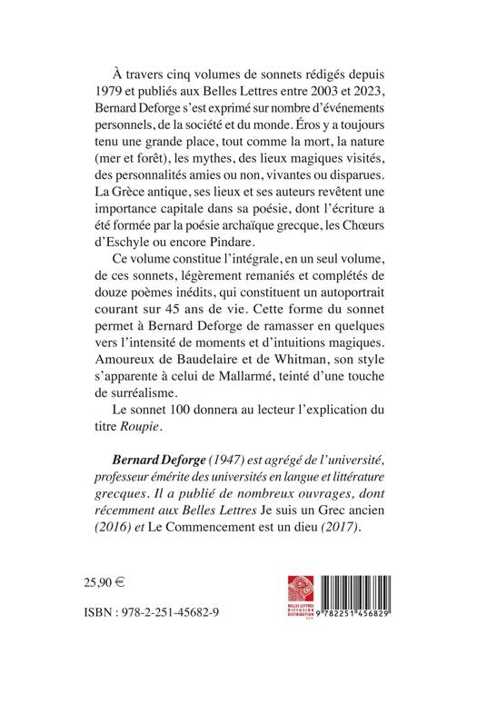 A travers cinq volumes de sonnets rediges depuis 1979 et publies aux Belles Lettres entre 2003 et 2023, Bernard Deforge s'est exprime sur nombre d'evenements personnels, de la societe et du monde. Eros y a toujours tenu une grande place, tout comme la mort, la nature (mer et foret), les mythes, des lieux magiques visites, des personnalites amies ou non, vivantes ou disparues. La Grece antique, ses lieux et ses auteurs revetent une importance capitale dans sa poesie, dont l'ecriture a ete formee par la poesie archaique grecque, les Choeurs d'Eschyle ou encore Pindare. Ce volume constitue l'integrale, en un seul volume, de ces sonnets, legerement remanies et completes de douze poemes inedits, qui constituent un autoportrait courant sur 45 ans de vie. Cette forme du sonnet permet a Bernard Deforge de ramasser en quelques vers l'intensite de moments et d'intuitions magiques. Amoureux de Baudelaire et de Whitman, son style s'apparente a celui de Mallarme, teinte d'une touche de surrealisme. Le sonnet 100 donnera au lecteur l'explication du titre Roupie.