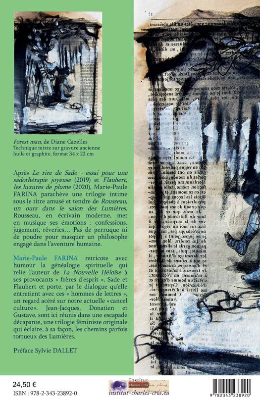 Après Le rire de Sade - essai pour une sadothérapie joyeuse (2019) et Flaubert, les luxures de plume (2020), Marie-Paule FARINA parachève une trilogie intime sous le titre amusé et tendre de Rousseau, un ours dans le salon des Lumières. Rousseau, en écrivain moderne, met en musique ses émotions : confessions, jugement, rêveries... Pas de perruque ni de poudre pour masquer un philosophe engagé dans l’aventure humaine, Marie-Paule FARINA retricote avec humour la généalogie spirituelle qui relie l’auteur de La Nouvelle Héloïse à ses provocants « frères d’esprit », Sade et Flaubert et porte, par le dialogue qu’elle entretient avec ces « hommes de lettres », un regard acéré sur notre actuelle « cancel culture ». Jean-Jacques, Donatien et Gustave, sont ici réunis dans une escapade décapante, une trilogie féministe originale qui éclaire, à sa façon, les chemins parfois tortueux des Lumières.