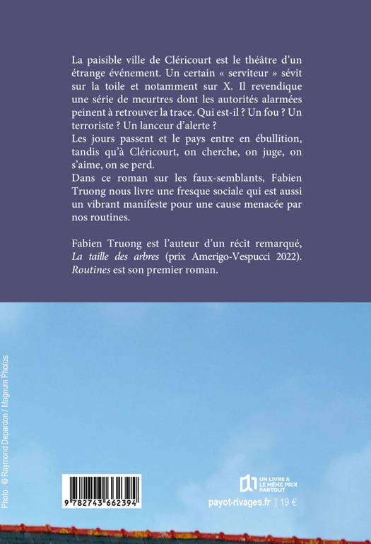 La paisible ville de Cléricourt est le théâtre d'un étrange événement. Un certain « serviteur » sévit sur la toile et notamment sur X. Il revendique une série de meurtres dont les autorités alarmées peinent à retrouver la trace. Qui est-il ? Un fou ? Un terroriste ? Un lanceur d'alerte ? Les jours passent et le pays entre en ébullition, tandis qu'à Cléricourt, on cherche, on juge, on s'aime, on se perd. Dans ce roman sur les faux-semblants, Fabien Truong nous livre une fresque sociale qui est aussi un vibrant manifeste pour une cause menacée par nos routines. Fabien Truong est l'auteur d'un récit remarqué, La taille des arbres (prix Amerigo-Vespucci 2022). Routines est son premier roman.