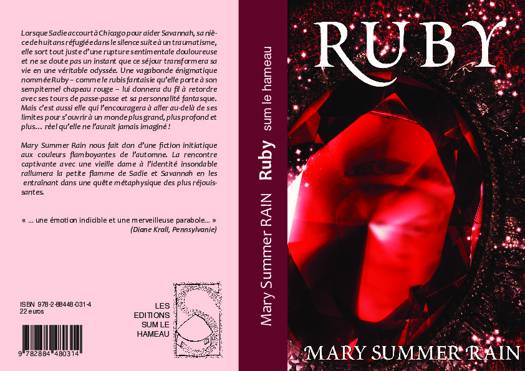 RUBY, Mary Summer Rain - Traduit de l'américain par Laetitia Ceccaldi - Jeune antiquaire dans une petite ville portuaire du Maine, Sadie Brennan croyait son avenir tout tracé. Confrontée à une rupture qu’elle n’attendait pas, elle voit ses rêves voler en éclats et les évènements imprévisibles s’enchaîner à une allure déconcertante. C’est ainsi qu’elle se retrouve à Chicago auprès de sa petite nièce de huit ans frappée de mutisme suite à un traumatisme. Une lueur d’espoir s’allume pour ces deux âmes désemparées sous les traits d’une vieille vagabonde dépenaillée qui les fascinera dès le premier jour. Sadie et Savannah vont alors focaliser toute leur énergie à découvrir l’identité de cette femme troublante et ainsi dévoiler bien des mystères … Mary Summer Rain nous fait don d’une fiction initiatique aux couleurs flamboyantes de l’automne. La rencontre captivante avec une vieille dame à l’identité insondable rallumera la petite flamme de Sadie et Savannah en les entraînant dans une quête métaphysique des plus réjouissantes.