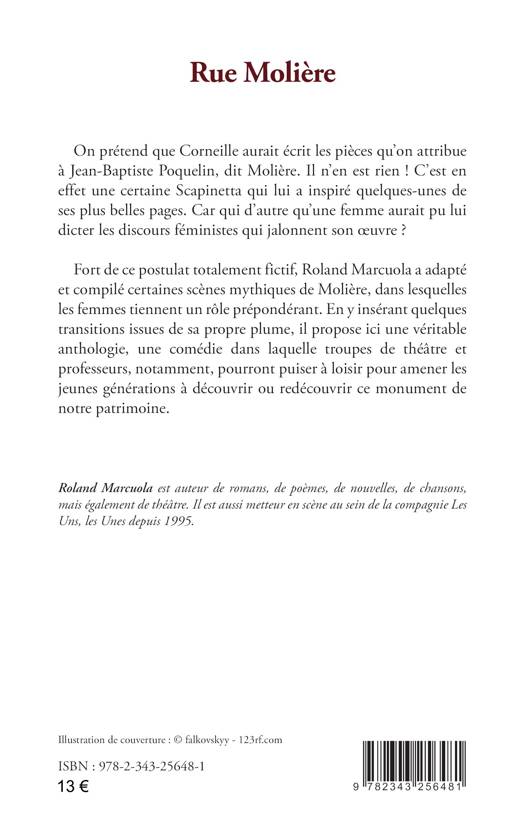 On prétend que Corneille aurait écrit les pièces qu’on attribue à Jean-Baptiste Poquelin, dit Molière. Il n’en est rien ! C’est en effet une certaine Scapinetta qui lui a inspiré quelques-unes de ses plus belles pages. Car qui d’autre qu’une femme aurait pu lui dicter les discours féministes qui jalonnent son œuvre ? Fort de ce postulat totalement fictif, Roland Marcuola a adapté et compilé certaines scènes mythiques de Molière, dans lesquelles les femmes tiennent un rôle prépondérant. En y insérant quelques transitions issues de sa propre plume, il propose ici une véritable anthologie, une comédie dans laquelle troupes de théâtre et professeurs, notamment, pourront puiser à loisir pour amener les jeunes générations à découvrir ou redécouvrir ce monument de notre patrimoine.