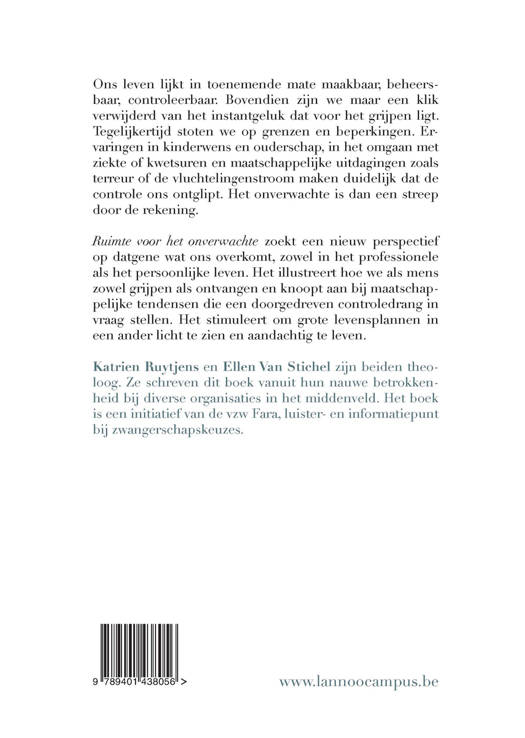 Hoe mensen helpen om te gaan met plotse tegenslagen Ons leven lijkt in toenemende mate maakbaar, beheersbaar, controleerbaar. Bovendien zijn we maar een klik verwijderd van het instantgeluk dat voor het grijpen ligt. Tegelijkertijd stoten we op grenzen en beperkingen. Ervaringen in kinderwens en ouderschap, in het omgaan met ziekte of kwetsuren en maatschappelijke uitdagingen zoals terreur of de vluchtelingenstroom maken duidelijk dat de controle ons ontglipt. Het onverwachte is dan een streep door de rekening. Ruimte voor het onverwachte zoekt een nieuw perspectief op datgene wat ons overkomt, zowel in het professionele als het persoonlijke leven. Het illustreert hoe we als mens zowel grijpen als ontvangen en knoopt aan bij maatschappelijke tendensen die een doorgedreven controledrang in vraag stellen. Het stimuleert om grote levensplannen in een ander licht te zien en aandachtig te leven.