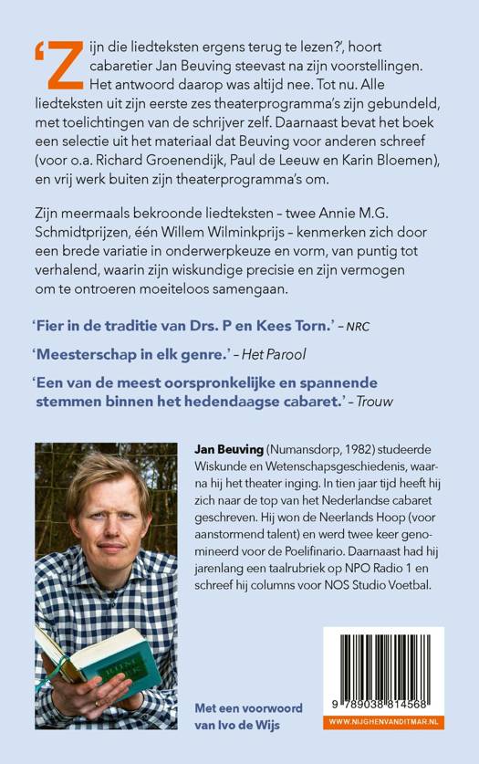 ‘Zijn die liedteksten ergens terug te lezen?’, hoort cabaretier Jan Beuving steevast na zijn voorstellingen. Het antwoord daarop was altijd nee. Tot nu. Alle liedteksten uit zijn eerste zes theaterprogramma’s zijn gebundeld, met toelichtingen van de schrijver zelf. Daarnaast bevat het boek een selectie uit het materiaal dat Beuving voor anderen schreef (voor o.a. Richard Groenendijk, Paul de Leeuw en Karin Bloemen), en vrij werk buiten zijn theaterprogramma’s om.