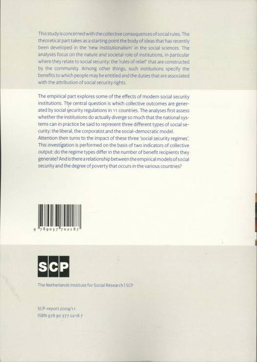 This study is concerned with the collective consequences of social rules. The theoretical analyses take as a starting point the notion of 'new institutionalism' in the social sciences. The analyses focus on the nature and societal role of institutions, and more specifically social security institutions: the 'rules of relief' that are constructed by the community. Among other things, those institutions lay down the benefit entitlements that people enjoy and the duties that have to be fulfilled in order to enjoy them. The empirical analyses explore some of the effects of modern social security institutions. The central question is which collective outcomes are generated by the social security rules in 11 countries. The analyses first investigate whether the institutions differ from each other to such an extent that the national systems can in practice be said to represent three different types of social security: the liberal, the corporatist and the social-democratic model.