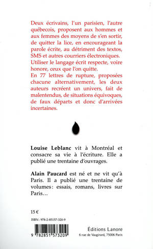 Deux écrivains, l'un parisien, l'autre québécois, proposent aux hommes et aux femmes des moyens de s'en sortir, de quitter la lice, en encourageant la parole écrite, au détriment des textos, SMS et autres courriers électroniques. Utiliser le langage écrit respecte, voire honore, ceux que l'on quitte. En 77 lettres de rupture, proposées chacune alternativement, les deux auteurs recréent un univers, fait de malentendus, de situations équivoques, de faux départs et donc d'arrivées incertaines.
