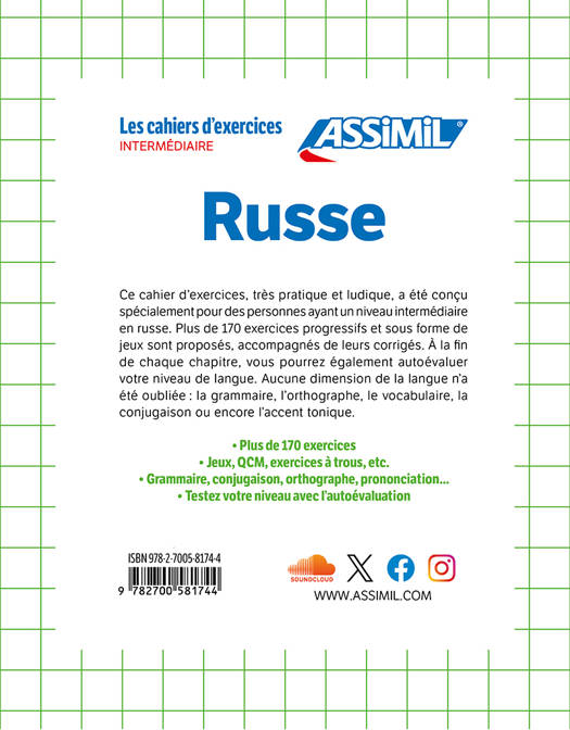 Ce cahier d'exercices, très pratique et ludique, a été conçu spécialement pour des personnes ayant un niveau intermédiaire en russe. Plus de 170 exercices progressifs et sous forme de jeux sont proposés, accompagnés de leurs corrigés. À la fin de chaque chapitre, vous pourrez également autoévaluer votre niveau de langue. Aucune dimension de la langue n'a été oubliée : la grammaire, l'orthographe, le vocabulaire, la conjugaison ou encore l'accent tonique.