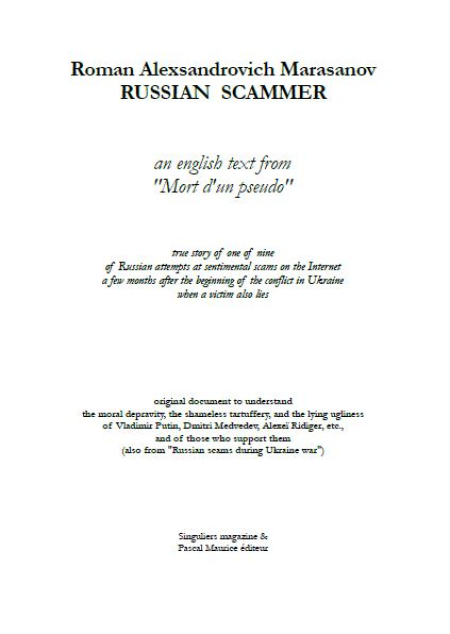 An english text from "Mort d'un pseudo" : true story of one of nine of Russian attempts at sentimental scams on the Internet a few months after the beginning of the conflict in Ukraine when a victim also lies... Original document to understand the moral depravity, the shameless tartuffery, and the lying ugliness of Putin, Medvedev, Goundiaïev, etc., and of those who support them (also from "Russian scams during Ukraine war").