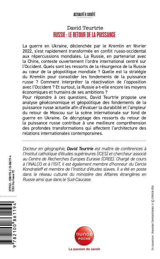 La guerre en Ukraine, déclenchée par le Kremlin en février 2022, s’est rapidement transformée en conflit russo-occidental aux répercussions mondiales. La Russie, en partenariat avec la Chine, conteste ouvertement l’ordre international centré sur l’Occident. Quels sont les ressorts de la résurgence de la Russie au cœur de la géopolitique mondiale ? Quelle est la stratégie du Kremlin pour consolider les fondements de la puissance russe ? Comment interpréter la réactivation de l’opposition avec l’Occident ? Et surtout, la Russie a-t-elle encore les moyens économiques et humains de ses ambitions ? Pour répondre à ces questions, David Teurtrie propose une analyse géoéconomique et géopolitique des fondements de la puissance russe actuelle afin d’évaluer la durabilité et l’ampleur du retour de Moscou sur la scène internationale sur fond de guerre en Ukraine. Ce décryptage des ressorts du retour de la puissance russe contribue à une meilleure compréhension des profondes transformations qui affectent l’architecture des relations internationales contemporaines.