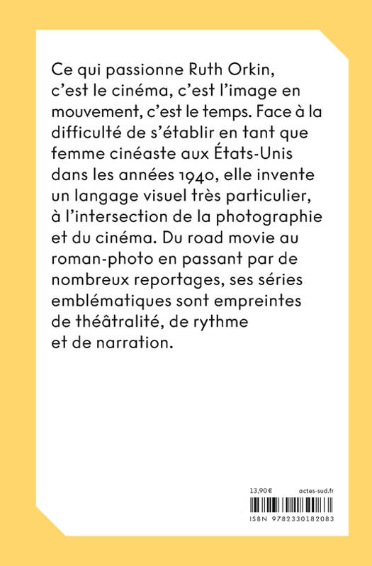 Ce qui passionne Ruth Orkin, c'est le cinéma, c'est l'image en mouvement, c'est le temps. Face à la difficulté de s'établir en tant que femme cinéaste aux États-Unis dans les années 1940, elle invente un langage visuel très particulier, à l'intersection de la photographie et du cinéma. Du road movie au roman photo en passant par de nombreux reportages, ses séries emblématiques sont empreintes de théâtralité, de rythme et de narration.
