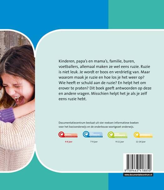 Kinderen, papa’s en mama’s, familie, buren, voetballers, allemaal maken ze wel eens ruzie. Ruzie is niet leuk. Je wordt er boos en verdrietig van. Maar waarom maak je ruzie en hoe los je het weer op? Wie heeft er schuld aan de ruzie? En helpt het om erover te praten? Dit boek geeft antwoorden op deze en andere vragen. Misschien helpt het je als je zelf eens ruzie hebt.