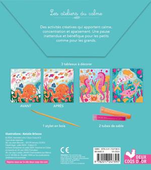 Une mini boîte proposant 3 tableaux à décorer avec du sable fluo, sur la thématique du monde sous-marin, réel et imaginaire : poissons, dauphin, hippocampes, coraux et même une sirène ! 2 tubes de sables colorés sont fournis : orange fluo, rose fluo. À l'aide d'un mode d'emploi et en suivant les modèles, l'enfant vient déposer le sable sur les zones définies pour enchanter ses tableaux.
