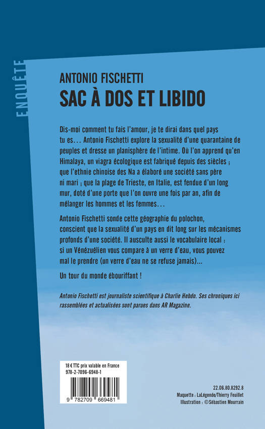 Dis-moi comment tu fais l’amour, je te dirai dans quel pays tu es… Antonio Fischetti explore la sexualité de 50 peuples et dresse un planisphère de l’intime. Où l’on apprend qu’en Himalaya, un viagra écologique est fabriqué depuis des siècles ; que l’ethnie chinoise des Na a élaboré une société sans père ni mari ; que la plage de Trieste, en Italie, est fendue d’un long mur, doté d’une porte que l’on ouvre une fois par an, afin de mélanger les hommes et les femmes…
