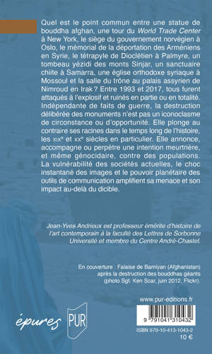 Quel est le point commun entre une statue de bouddha afghan, une tour du World Trade Center à New York, le siège du gouvernement norvégien à Oslo, le mémorial de la déportation des Arméniens en Syrie, le tétrapyle de Dioclétien à Palmyre, un tombeau yézidi des monts Sinjar, un sanctuaire chiite à Samarra, une église orthodoxe syriaque à Mossoul et la salle du trône au palais assyrien de Nimroud en Irak ? Entre 1993 et 2017, tous furent attaqués à l’explosif et ruinés en partie ou en totalité. Indépendante de faits de guerre, la destruction délibérée des monuments n’est pas un iconoclasme de circonstance ou d’opportunité. Elle plonge au contraire ses racines dans le temps long de l’histoire, les XIXe et XXe siècles en particulier. Elle annonce, accompagne ou perpètre une intention meurtrière, et même génocidaire, contre des populations. La vulnérabilité des sociétés actuelles, le choc instantané des images et le pouvoir planétaire des outils de communication amplifient sa menace et son impact au-delà du dicible.