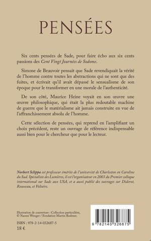 Six cents pensées de Sade, pour faire écho aux six cents passions des Cent Vingt Journées de Sodome. Simone de Beauvoir pensait que Sade revendiquait la vérité de l'homme contre toutes les abstractions qui ne sont que des fuites, et écrivait qu'il avait dépassé le sensualisme de son époque pour le transformer en une morale de l'authenticité. De son côté, Maurice Heine voyait en son oeuvre une oeuvre philosophique, qui était la plus redoutable machine de guerre que le matérialisme ait jamais construite en vue de l'affranchissement absolu de l'homme. Cette sélection de pensées, qui reprend en l'amplifiant un choix précédent, reste un ouvrage de référence indispensable aussi bien pour le chercheur que pour le lecteur.