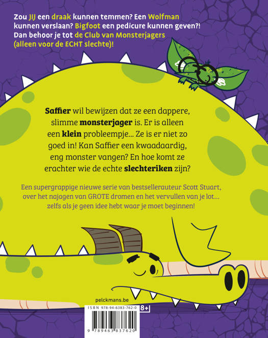 Saffier wil bewijzen dat ze een dappere, slimme Monsterjager is. Er is alleen één klein probleempje… ze is er niet zo goed in! Kan Saffier een kwaadaardig, eng monster vangen? En hoe komt ze erachter wie de echte slechteriken zijn?Zou JIJ een draak kunnen temmen? Een Wolfman kunnen verslaan? Bigfoot een pedicure kunnen geven?! Een grappige en inspirerende nieuwe serie van bestsellerauteur Scott Stuart, over het najagen van GROTE dromen en het vervullen van je lot… zelfs als je geen idee hebt waar je moet beginnen!