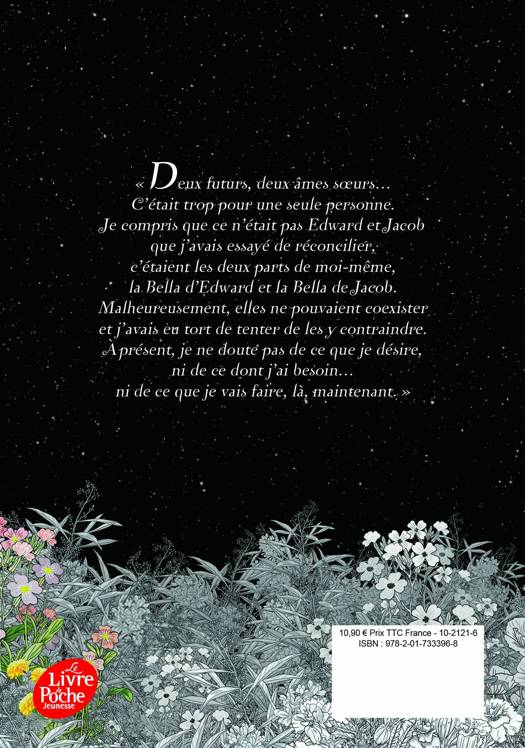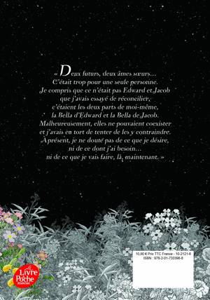 « Deux futurs, deux âmes soeurs... C’était trop pour une seule personne. Je compris que ce n’était pas Edward et Jacob que j’avais essayé de réconcilier, c’étaient les deux parts de moi-même, la Bella d’Edward et la Bella de Jacob. Malheureusement, elles ne pouvaient coexister et j’avais eu tort de tenter de les y contraindre. A présent, je ne doute pas de ce que je désire, ni de ce dont j’ai besoin... ni de ce que je vais faire, là, maintenant. ».