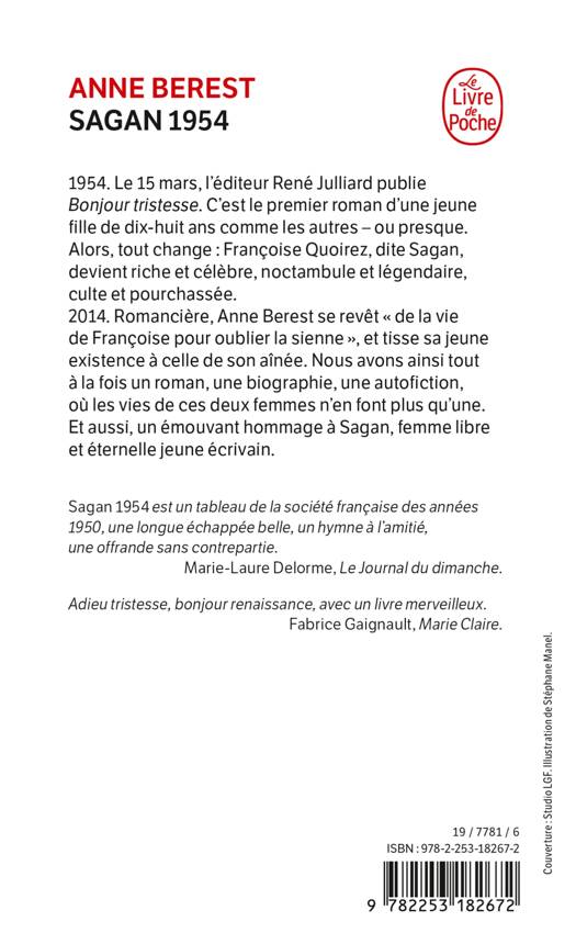 1954. Le 15 mars, l'éditeur René Julliard publie Bonjour tristesse. C’est le premier roman d’une jeune fille de dix-huit ans comme les autres – ou presque. Alors, tout change : Françoise Quoirez, dite Sagan, devient riche et célèbre, noctambule et légendaire, culte et pourchassée. 2014. Romancière, Anne Berest se revêt « de la vie de Françoise pour oublier la sienne », et tisse sa jeune existence à celle de son aînée. Nous avons alors tout à la fois un roman, une biographie, une autofiction, où les vies de ces deux femmes n'en font plus qu'une. Et aussi, un émouvant hommage à Sagan, femme libre et éternelle jeune écrivain.