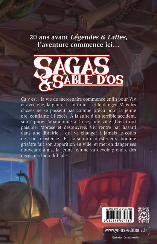 20 ans avant Légendes & Lattes, l’aventure commence ici… Ça y est : la vie de mercenaire commence enfin pour Viv et avec elle, la gloire, la fortune… et le danger. Mais les choses ne se passent pas comme prévu pour la jeune orc, confiante à l’excès. À la suite d’un terrible accident, son équipe l’abandonne à Grise, une ville (bien trop) paisible. Morose et désœuvrée, Viv rentre par hasard dans une librairie… qui va changer à jamais le cours de son existence. Et lorsqu’un mystérieux homme grisâtre fait son apparition en ville, et met en danger ses nouveaux amis, la jeune femme va devoir prendre des décisions bien difficiles.
