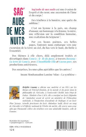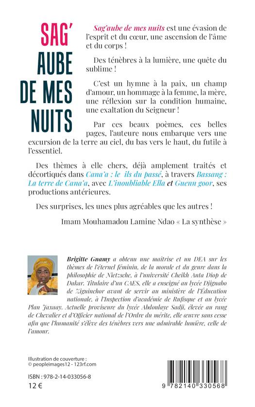 Sag'aube de mes nuits est une évasion de l'esprit et du coeur, une ascension de l'âme et du corps ! C'est un hymne à la paix, un champ d'amour, un hommage à la femme, la mère, une réflexion sur la condition humaine, une exaltation du Seigneur ! Par ces poèmes, l'auteure nous embarque vers une excursion de la terre au ciel, du bas vers le haut, du futile à l'essentiel.