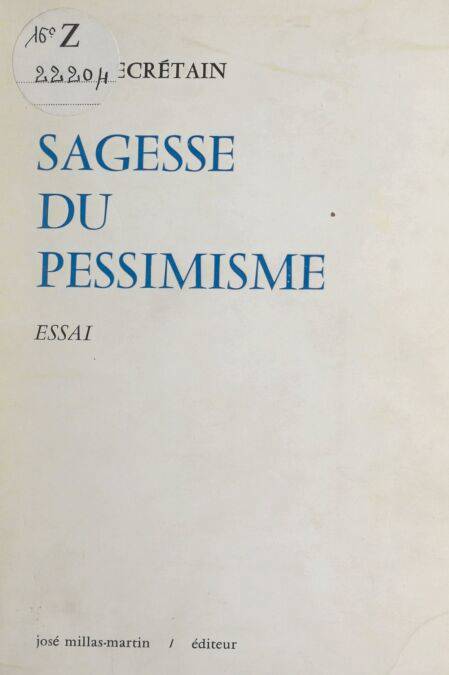 Roger Secrétain fut, dans les années d’avant-guerre, l’un des jeunes boursiers de la Fondation Blumenthal. Journaliste, il est directeur d’un quotidien régional. Homme politique, il fut maire d’Orléans pendant douze ans. Il est avant tout écrivain. Il a publié une série d’essais : "Destins du poète", "Quand montait l’orage", "Ceux qui ont éclairé nos chemins". C’est l’un des meilleurs exégètes et biographes de Péguy, de Max Jacob, et aussi de Montherlant, qui a rendu hommage à sa pénétration. Il ne se borne cependant pas à la critique. Sa pensée poétique s’est exprimée dans les évocations de Saint-Jean-du-Ciel, à mi-chemin de la nouvelle et de l’élégie. Aujourd’hui, une pensée plus philosophique lui inspire des réflexions sur notre temps, sur le destin de l’homme, sur sa vie, sur lui-même. Dans la densité et la chaleur du style, c’est à la fois une méditation, une analyse, une confidence. Il ne s’agit pas de mémoires, mais d’une résurrection sporadique et nostalgique des souvenirs, portant signification esthétique et morale. Sur la crise contemporaine — crise de l’esprit et de la culture, crise du politique et du social — Roger Secrétain apporte son témoignage. Et si son essai, comme le titre l’indique, prend, par sa lucidité même, un ton pessimiste, il est en même temps dédié à la sagesse.
