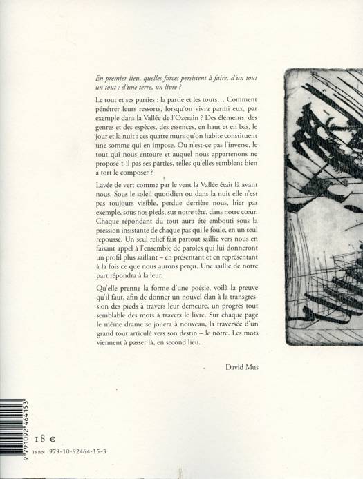 Le tout et ses parties : la partie et les touts... Comment pénétrer leurs ressorts, lorsqu'on vivra parmi eux, par exemple dans la Vallée de l'Ozerain ? Des éléments, des genres et des espèces, des essences, en haut et en bas, le jour et la nuit : ces quatre murs qu'on habite constituent une somme qui en impose. Ou n'est-ce pas l'inverse, le tout qui nous entoure et auquel nous appartenons ne propose-t-il pas ses parties, telles quelles semblent bien à tort le composer ?