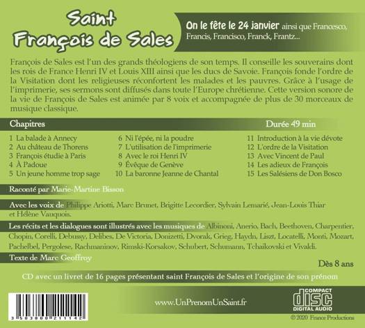 Cette version sonore de la vie de saint François de Sales est animée par 10 voix et accompagnée de plus de trente morceaux de musique classique. François de Sales est l'un des grands théologiens de son temps. Il conseille les souverains dont les rois de France Henri IV et Louis XIII ainsi que les ducs de Savoie. François fonde l'ordre de la Visitation dont les religieuses réconfortent les malades et les pauvres. Grâce à l'usage de l'imprimerie inventée quelques années auparavant, ses sermons sont diffusés dans l'Europe chrétienne. Cette version sonore de la vie de François de Sales est animée par 10 voix et accompagnée de plus de 30 morceaux de musique classique. Conté par des acteurs et illustré par des musiques classiques, le récit de la vie de saint François de Sales fait évoluer l'enfant dans l'univers de ce saint exemplaire.