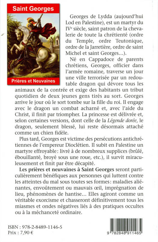 Georges de Lydda (aujourd'hui Lod en Palestine), est un martyr du IVe siècle, saint patron de la chevalerie de toute la chrétienté (ordre du Temple, ordre Teutonique, ordre de la Jarretière, ordre de saint Michel et saint Georges...). Né en Cappadoce de parents chrétiens, Georges, officier dans l'armée romaine, traverse un jour une ville terrorisée par un redoutable dragon qui dévore tous les animaux de la contrée et exige des habitants un tribut quotidien de deux jeunes gens tirés au sort. Georges arrive le jour où le sort tombe sur la fille du roi. Il engage avec le dragon un combat acharné et, avec l'aide du Christ, il finit par triompher. La princesse est délivrée et, selon certaines versions, dont celle de la Légende dorée, le dragon, seulement blessé, lui reste désormais attaché comme un chien fidèle. Plus tard, Georges est victime des persécutions antichrétiennes de l'empereur Dioclétien. Il subit en Palestine un martyre effroyable : livré à de nombreux supplices (brûlé, ébouillanté, broyé sous une roue, etc.), il survit miraculeusement et finit par être décapité. Les prières et neuvaines à Saint Georges seront particulièrement bénéfiques aux personnes qui luttent contre les atteintes du mal sous toutes ses formes : maladies aliénantes, envoûtement ou mauvais oeil, imprégnation de lieu, phénomènes de hantise... Elles agiront comme un véritable exorcisme et chasseront définitivement tous les miasmes et ondes négatives liés à des pratiques occultes ou à la méchanceté ordinaire.
