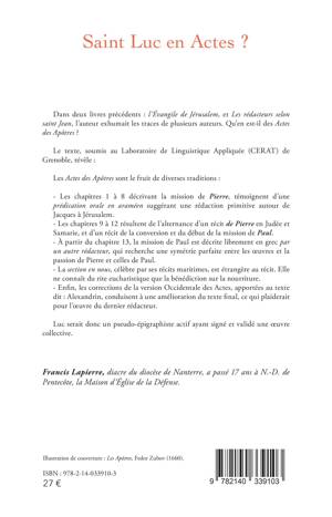 Dans deux livres précédents: L'Évangile de Jérusalem, et Les rédacteurs selon saint Jean, l'auteur exhumait les traces de plusieurs auteurs. Qu'en est-il des Actes des Apôtres ? Le texte, soumis au Laboratoire de Linguistique Appliquée (CERAT) de Grenoble, révèle que les Actes des Apôtres sont le fruit de diverses traditions. Luc serait donc un pseudo-épigraphiste actif ayant signé et validé une oeuvre collective.