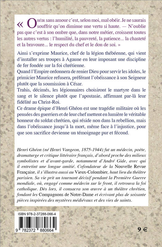 « Obéir sans amour c’est, selon moi, mal obéir. Je ne saurais souffrir qu’on diminue une vertu si haute. — N’oublie pas que c’est à son ombre que, dans notre métier, croissent toutes les autres vertus : l’humilité, la pauvreté, la patience... la chasteté et la bravoure... le respect du chef et le don de soi. » Ainsi s’exprime Maurice, chef de la légion thébéenne, qui impose à ses troupes une discipline de fer fondée sur la foi chrétienne. Quand l’Empire ordonnera de renier Dieu pour servir les idoles, le primicier Maurice refusera, préférant l’obéissance à son Seigneur plutôt que la soumission à César. Trahis, décimés, les légionnaires choisiront le martyre dans le sang et le silence plutôt que l’apostasie, affirmant par-là leur fidélité au Christ-Roi. Henri Ghéon signe une tragédie militaire où l’honneur du soldat chrétien se révèle dans l’obéissance jusqu’à la mort. Face à l’injustice, le sacrifice devient témoignage, non par la rébellion, mais par la fidélité.