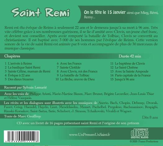 Conté par des acteurs et illustré par des musiques classiques, le récit de la vie de saint Rémi fait évoluer l'enfant dans l'univers de ce saint exemplaire. Cette version sonore de la vie de saint Rémi est animée par 10 voix et accompagnée de plus de trente morceaux de musique classique. Rémi est élu évêque de Reims à seulement 22 ans et le demeura jusqu'à sa mort à l'âge de 97 ans. Très vite célèbre grâce à ses nombreuses guérisons, il se lie d'amitié avec Clovis, un jeune chef franc et devient son conseiller. Après avoir remporté la bataille de Tolbiac, Clovis se convertit au christianisme et est baptisé avec 3 000 de ses hommes par l'évêque de Reims. Cette version sonore de la vie de saint Rémi est animée par 10 voix et accompagnée de plus de 30 morceaux de musique classique.