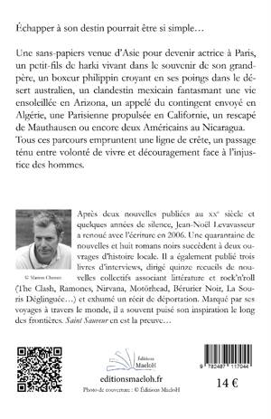 Échapper à son destin pourrait être si simple… Une sans-papier venue d’Asie pour devenir actrice à Paris, un petit-fils de Harki vivant dans le souvenir de son grand-père, un boxeur philippin croyant en ses poings dans le désert australien, un clandestin mexicain fantasmant une vie ensoleillée en Arizona, un appelé du contingent envoyé en Algérie, une Parisienne propulsée en Californie, un rescapé de Mauthausen ou encore deux Américains au Nicaragua. Tous ces parcours empruntent une ligne de crête, un passage ténu entre volonté de vivre et découragement face à l’injustice des hommes.