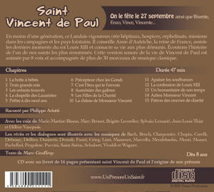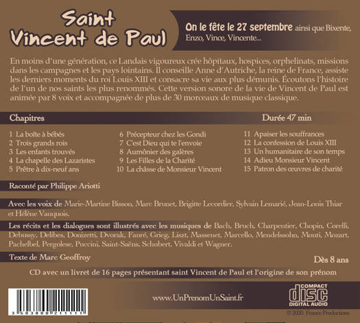 Conté par des acteurs et illustré par des musiques classiques, le récit de la vie de saint Vincent de Paul fait évoluer l'enfant dans l'univers de ce saint exemplaire. Cette version sonore de la vie de saint Vincent de Paul est animée par 10 voix et accompagnée de plus de trente morceaux de musique classique.