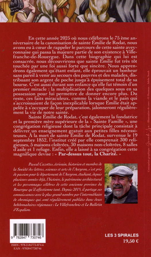 En cette année 2025 où nous célébrons le 75e anniversaire de la canonisation de sainte Émilie de Rodat, nous avons eu à coeur de rappeler le parcours de cette sainte aveyronnaise qui passa la majeure partie de son existence à Villefranche-de-Rouergue. Dans cette biographie qui lui est consacrée, nous découvrirons que sainte Émilie fut très tôt touchée par une foi aussi forte que sincère. Nous apprendrons également qu’étant enfant, elle éprouvait un bonheur sans pareil à venir au secours des pauvres et des malades, distribuant son argent de poche jusqu’à épuisement total de sa bourse. C’est aussi durant son enfance qu’elle fut témoin d’un premier miracle : la multiplication des quelques sous en sa possession pour lui permettre de donner encore plus. Du reste, ces faits miraculeux, comme la viande et le pain qui s’accroissaient de façon inexplicable lorsque Émilie était appelée à s’occuper de leur préparation, jalonneront régulièrement la vie de notre sainte. Sainte Émilie de Rodat, c’est également la fondatrice et la première mère supérieure de la « Sainte Famille », une congrégation religieuse dont la tâche principale consistait à délivrer un enseignement gratuit aux petites filles nécessiteuses. À la mort de sainte Émilie de Rodat, survenue le 19 septembre 1852, l’institut créé par elle comprenait 300 religieuses, 5 maisons cloîtrées, 30 maisons non-cloîtrées, 8 salles d'asile et 1 refuge. Enfin, elle a laissé à sa congrégation cette magnifique devise : « Par-dessus tout, la Charité. »
