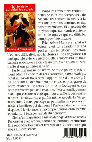 Parmi les attributions traditionnelles de la Sainte Vierge, celle de "défaire les nœuds" demeure à la fois une des plus connues et des plus mystérieuses. Elle procède de la symbolique du noeud : représentation de tout ce qui est difficile, compliqué, inextricable. Prier sainte Marie qui défait les noeuds, c'est lui abandonner nos péchés, nos tentations, nos troubles, nos difficultés, nos faiblesses et nos angoisses ! En tant que Mère de Miséricorde, elle s'empressera de nous secourir et dénouera alors ces noeuds, avec un amour sans limite et une patience sans fin. Par le mécanisme de neuvaine et de prières spécialement adapté à chacun des cas concernés, sainte Marie qui défait les noeuds nous offre l'opportunité d'une aide précieuse quant au dénouement des crises les plus graves de notre existence, de celles qui nous préoccupent et que nous n'arrivons jamais à résoudre. Il est scientifiquement établi que certains noeuds qui nous assaillent peuvent remonter à la naissance, et parfois même au-delà. La Vierge, notre mère à tous, participe en particulier aux problèmes liés à la famille et qui tiennent à l'entente du couple, aux disputes, à la violence, à l'incompréhension entre parents et enfants, à tous ces noeuds du désespoir... Rien n'est impossible à sainte Marie qui défait les noeuds. Parlons-lui avec amour, confiance, humilité et sincérité. Elle répondra toujours et très vite aux sollicitations que nous lui adresserons.