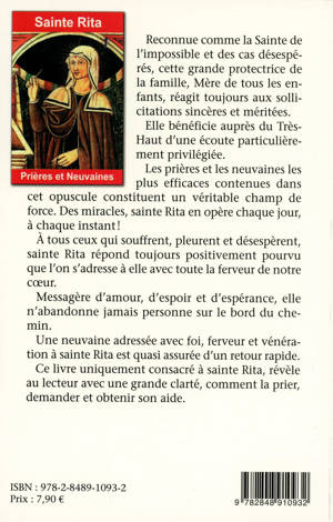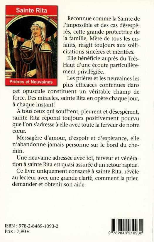 Reconnue comme la Sainte de l'impossible et des cas désespérés, cette grande protectrice de la famille, Mère de tous les enfants, réagit toujours aux sollicitations sincères et méritées. Elle bénéficie auprès du Très-Haut d'une écoute particulièrement privilégiée. Les prières et les neuvaines les plus efficaces contenues dans cet opuscule constituent un véritable champ de force. Des miracles, sainte Rita en opère chaque jour, à chaque instant ! A tous ceux qui souffrent, pleurent et désespèrent, sainte Rita répond toujours positivement pourvu que l'on s'adresse à elle avec toute la ferveur de notre coeur. Messagère d'amour, d'espoir et d'espérance, elle n'abandonne jamais personne sur le bord du chemin. Une neuvaine adressée avec foi, ferveur et vénération à sainte Rita est quasi assurée d'un retour rapide. Ce livre uniquement consacré à sainte Rita, révèle au lecteur avec une grande clarté, comment la prier, demander et obtenir son aide.