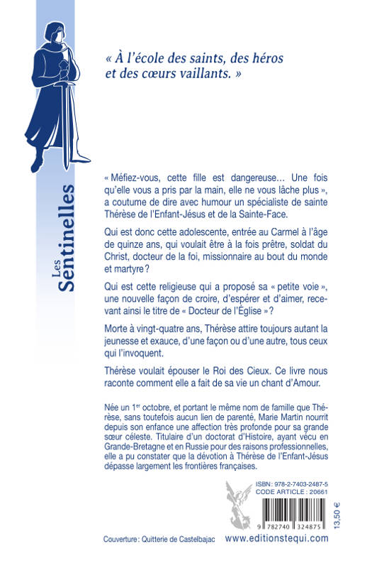 « Méfiez-vous, cette fille est dangereuse... Une fois qu'elle vous a pris par la main, elle ne vous lâche plus... », a coutume de dire avec humour un des plus grands spécialistes de sainte Thérèse de l'Enfant-Jésus. Qui est donc cette adolescente, qui voulait être à la fois prêtre, soldat du Christ, docteur de la foi, missionnaire au bout du monde et martyre... mais qui entre au carmel à l'âge de 15 ans ? Qui est cette jeune religieuse qui compose des poésies et des pièces de théâtre, et à qui l'on demande de mettre par écrit tous ses souvenirs d'enfance ? Qui est-elle pour imaginer une nouvelle façon de croire, d'espérer et d'aimer, à tel point que le pape Jean-Paul II lui donne le titre de « Docteur de l'Eglise » ? Qu'a-t-elle donc fait, Thérèse, morte à seulement vingt-quatre ans, pour que, d'un bout à l'autre de la planète, elle fascine toujours autant la jeunesse et exauce, d'une façon ou d'une autre, tous ceux qui l'implorent ?