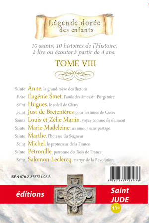 10 saints, 10 histoires de l'Histoire, à lire ou écouter à partir de 4 ans. Sainte Anne, la grand-mère des Bretons ; Bhse Eugénie Smet, l'amie des âmes du Purgatoire Saint Hugues, le soleil de Cluny ; Saint Just de Bretenières, pour les âmes de Corée Saints ; Louis et Zélie Martin, voyez comme ils s'aiment ; Sainte Marie-Madeleine, un amour sans partage ; Sainte Marthe, l'hôtesse du Seigneur ; Saint Michel, le protecteur de la France ; Sainte Pétronille, patronne des Rois de France ; Saint Salomon Leclercq, martyr de la Révolution