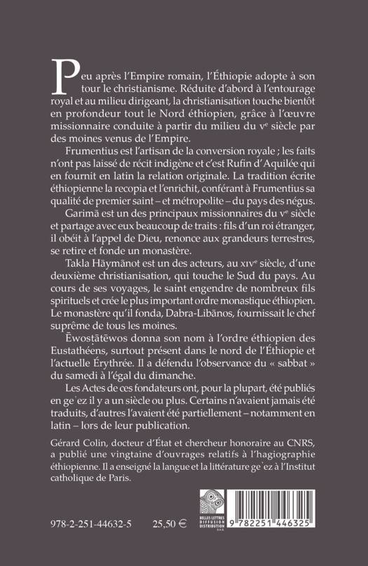 Gerard Colin a choisi d'eclairer deux moments essentiels de l'histoire du christianisme ethiopien en donnant a lire, pour la premiere fois en francais, les Vies de quatre saints. Le premier, Frumentius, est l'evangelisateur de l'Ethiopie, celui qui convertit le royaume d'Aksum au christianisme au IVe siecle. Garima, le second saint, est l'un des nombreux moines qui au cours du VIe siecle repandit le monachisme en Ethiopie et fonda l'une des premieres communautes monastiques du royaume. Une introduction de Christian Robin permet de resituer l'histoire de la christianisation de l'Ethiopie dans le contexte regional. Le second moment mis en lumiere dans cet ouvrage concerne le developpement de reseaux monastiques au sein du royaume chretien: l'un au Sud, dans la region du Choa, fonde par saint Takla Haymanot; l'autre au Nord, dans la region du Sera'e, fonde par Ewostatewos. Une introduction de Marie-Laure Derat retrace l'histoire de ces deux mouvements monastiques et de leurs relations avec le pouvoir royal entre les XIIIe et XVe siecles. Cet ouvrage rend ainsi accessible des textes ethiopiens qui, pour certains, n'avaient pas ete traduits - c'est le cas de la Vie de Garima -, ne l'avaient ete que partiellement - la recension de Waldebba de la Vie de Takla Haymanot - ou n'avaient ete traduits qu'en latin - a l'exemple de la Vie d'Ewostatewos.