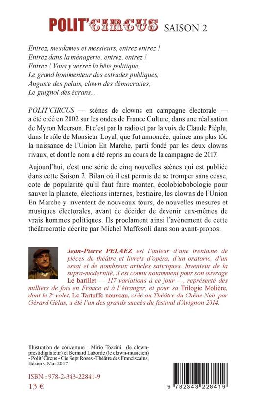 POLIT'CIRCUS - scènes de clowns en campagne électorale - a été créé en 2002 sur les ondes de France Culture, dans une réalisation de Myron Meerson. Et c'est par la radio et par la voix de Claude Piéplu, dans le rôle de Monsieur Loyal, que fut annoncée, quinze ans plus tôt, la naissance de l'Union En Marche, parti fondé par les deux clowns rivaux, et dont le nom a été repris au cours de la campagne de 2017.Aujourd'hui, c'est une série de cinq nouvelles scènes qui est publiée dans cette Saison 2. Bilan où il est permis de se tromper sans cesse, cote de popularité qu'il faut faire monter, écolobiobobologie pour sauver la planète, élections internes, bestiaire, les clowns de l'Union En Marche y inventent de nouveaux tours, de nouvelles mesures et musiques électorales, avant de décider de devenir eux-mêmes de vrais hommes politiques.