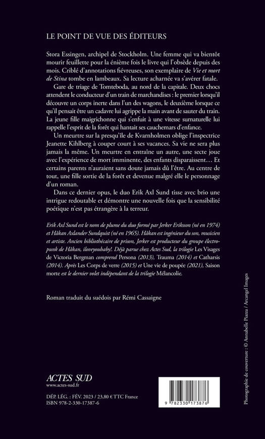 Stora Essingen, archipel de Stockholm. Une femme qui va bientôt mourir feuillette pour la énième fois le livre qui l'obsède depuis des mois. Criblé d'annotations fiévreuses, son exemplaire de "Vie et mort de Stina" tombe en lambeaux. Sa lecture acharnée va s'avérer fatale. Gare de triage de Tomteboda, au nord de la capitale. Deux chocs attendent le conducteur d'un train de marchandises : le premier lorsqu'il découvre un corps inerte dans l'un des wagons, le deuxième lorsque ce qu'il pensait être un cadavre lui agrippe la main avant de sauter du train. La jeune fille maigrichonne qui s'enfuit à une vitesse surnaturelle lui rappelle l'esprit de la forêt qui hantait ses cauchemars d'enfance. Un meurtre sur la presqu'île de Kvarnholmen oblige l'inspectrice Jeanette Kihlberg à couper court à ses vacances. Sa vie ne sera plus jamais la même. Un meurtre en entraîne un autre, une secte joue avec l'expérience de mort imminente, des enfants disparaissent... Et certains parents n'auraient sans doute jamais dû l'être. Au centre de tout, une fille sortie de la forêt et devenue malgré elle le personnage d'un roman. Dans ce dernier opus, le duo Erik Axl Sund tisse avec brio une intrigue redoutable et démontre une nouvelle fois que la sensibilité poétique n'est pas étrangère à la terreur.