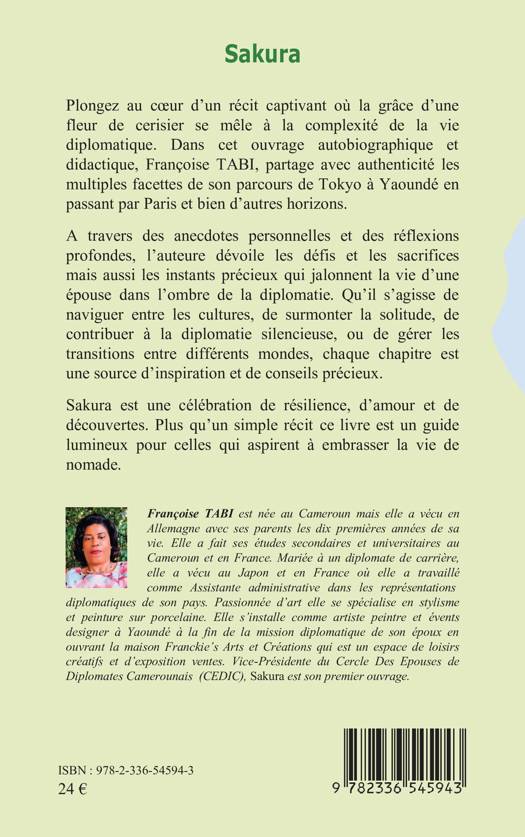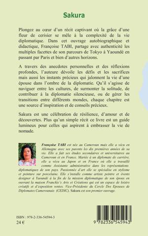 Plongez au coeur d'un récit captivant où la grâce d'une fleur de cerisier se mêle à la complexité de la vie diplomatique. Dans cet ouvrage autobiographique et didactique, Françoise TABI, partage avec authenticité les multiples facettes de son parcours de Tokyo à Yaoundé en passant par Paris et bien d'autres horizons. A travers des anecdotes personnelles et des réflexions profondes, l'auteure dévoile les défis et les sacrifices mais aussi les instants précieux qui jalonnent la vie d'une épouse dans l'ombre de la diplomatie. Qu'il s'agisse de naviguer entre les cultures, de surmonter la solitude, de contribuer à la diplomatie silencieuse, ou de gérer les transitions entre différents mondes, chaque chapitre est une source d'inspiration et de conseils précieux. Sakura est une célébration de résilience, d'amour et de découvertes. Plus qu'un simple récit ce livre est un guide lumineux pour celles qui aspirent à embrasser la vie de nomade.