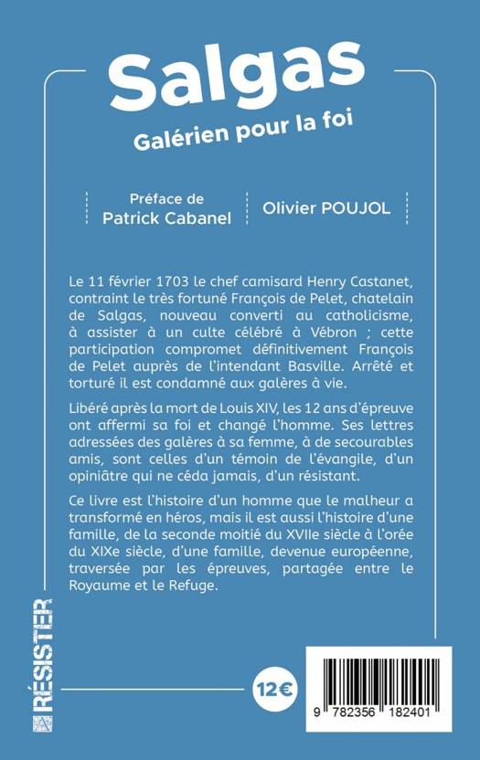 Le 11 févier 1703 le chef camisard Henry Castanet, contraint le très fortuné François de Pelet, chatelain de Salgas, nouveau converti au catholicisme, à assister à un culte célébré à Vébron ; cette participation compromet définitivement François de Pelet auprès de l'intendant Basville. Arrêté et torturé il est condamné aux galères à vie. Libéré après la mort de Louis XIV, les 12 ans d'épreuves ont affermi sa foi et changé l'homme. Ses lettres adressées des galères à sa femme, à de secourables amis, sont celles d'un témoin de l'évangile, d'un opiniâtre qui ne céda jamais, d'un résistant. Ce livre est l'histoire d'un homme que le malheur a transformé en héros, mais il est aussi l'histoire d'une famille, de la seconde moitié du XVIIIe siècle à l'orée du XIXe siècle, devenue européenne, traversée par les épreuves, partagée entre le Royaume et le Refuge.