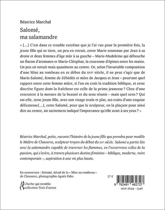 « [...] C’est dans ce trouble extrême que je l’ai vue pour la première fois, la jeune fille qui se tient, un peu en retrait, entre Marie soutenue par Jean à sa droite et deux femmes d’âge mûr à sa gauche – Marie-Madeleine qui débouche un flacon d’aromates et Marie-Cléophas, la couronne d’épines entre les mains. Un peu en retrait mais quasiment au centre. Or, selon l’invariable composition d’une Mise au tombeau en ce début du XVIe siècle, il ne peut s’agir que de Marie-Salomé, femme de Zébédée et mère de Jacques et Jean – pourtant quel rapport entre cette femme mûre, si l’on en croit la tradition biblique, et cette discrète figure dont la fraîcheur est celle de la prime jeunesse ? Choc d’une rencontre à la mesure de la beauté et du sens réunis – mais quel sens ? Qui est-elle, cette jeune fille, avec son visage ovale et plat, ses traits d’une exquise délicatesse[...], cette Salomé, pour que le sculpteur, en la plaçant pour ainsi dire au centre, ait tacitement indiqué l’importance qu’elle avait à ses yeux ? »