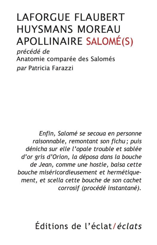 Si la très jeune danseuse contorsionniste des Évangiles hante l'art et la peinture depuis les descriptions priapiques d'Augustin ou de Jean Chrysostome, c'est au cœur du XIXe siècle que Salomé entre de plain-pied et en grande pompe dans la littérature, avec l'Hérodias de Flaubert, suivi par Huysmans, avant qu'à son tour Jules Laforgue s'en mêle et qu'Apollinaire, enfin, ferme le bal avec le nouveau siècle. Sont rassemblées ici leurs quatre ‘Salomé', auxquelles s'ajoute une cinquième, de Gustave Moreau, ainsi que quelques images choisies et en couleur, qui laissent entrevoir le mythe tout entier d'une fillette aux prises avec le pouvoir et la cruauté des hommes et des femmes. Tour à tour figure de la pleine soumission ou de la détermination tranchée, Salomé intrigue et gêne. Elle traverse les couloirs des siècles avec son cortège de têtes coupées, de danses des sept voiles et d'ingénuité libertine, qui risque de faire pâlir ou rougir ou s'étrangler de rage les sycophantes de nos sombres temps. Serait-elle cet ange sphérique que décrit Patricia Farazzi dans sa préface ?