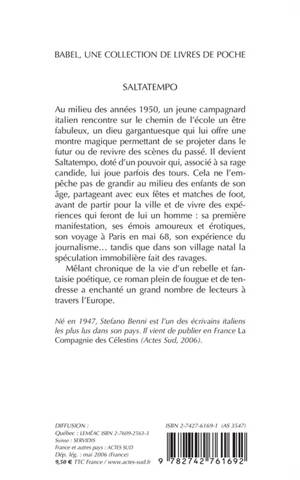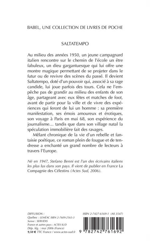 Au milieu des années 1950, un jeune campagnard italien rencontre sur le chemin de l'école un être fabuleux, un dieu gargantuesque qui lui offre une montre magique permettant de se projeter dans le futur ou de revivre des scènes du passé. Il devient Saltatempo, doté d'un pouvoir qui, associé à sa rage candide, lui joue parfois des tours. Cela ne l'empêche pas de grandir au milieu des enfants de son âge, partageant avec eux fêtes et matches de foot, avant de partir pour la ville et de vivre des expériences qui feront de lui un homme : sa première manifestation, ses émois amoureux et erotiques, son voyage à Paris en mai 68, son expérience du journalisme... tandis que dans son village natal la spéculation immobilière fait des ravages. Mêlant chronique de la vie d'un rebelle et fantaisie poétique, ce roman plein de fougue et de tendresse a enchanté un grand nombre de lecteurs à travers l'Europe.