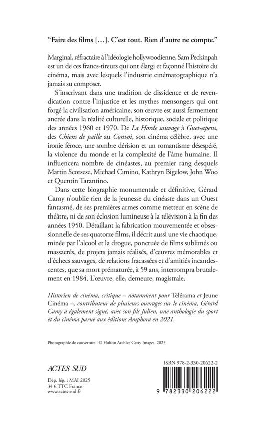 Si certains de ses films sont bien connus du grand public (La Horde sauvage, Les Chiens de paille, Le Guet-apens, Le Convoi), Sam Peckinpah, après avoir été au firmament d'Hollywood à l'orée des années 1970, n'est certainement pas, aujourd'hui, le plus populaire des cinéastes américains. Pourtant, ce franc-tireur avec lequel les studios n'ont jamais su comment composer, mort à cinquante-neuf ans, a imposé, avec ses quatorze films, une "Peckinpah touch" qui a influencé et influence encore bien des cinéastes. Ses oeuvres, devenues des classiques du cinéma américain, sont toujours étudiées pour ce qu'elles disent de la violence du monde et de la complexité de l'âme humaine. Gérard Camy signe ici la première biographie d'ampleur de ce géant du cinéma.